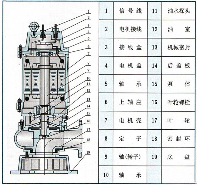 污水提升泵由電機(jī)與泵兩部分組成,二者通過油隔離室及機(jī)械密封組件隔開,屬機(jī)電一體化產(chǎn)品,電機(jī)與泵合用同一軸(轉(zhuǎn)子)整個水泵長度短,結(jié)構(gòu)緊湊。配備多種保護(hù)裝置,使得泵運(yùn)行可靠,其主部件作用如下: