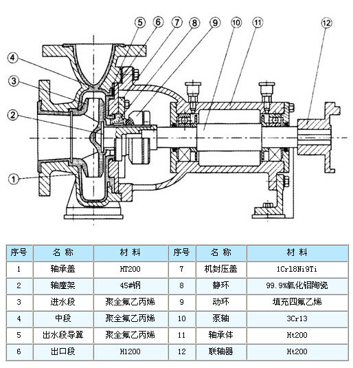 IHF型泵為單級單吸式氟塑料合金化工離心泵(簡稱氟塑料泵離心泵),是按國標(biāo)設(shè)計并結(jié)合非金屬泵的加工工藝設(shè)計生產(chǎn)的。該泵具有耐腐蝕、耐磨、耐高溫、不老化、機(jī)械強(qiáng)度高、無毒分解、使用溫度寬等優(yōu)點。泵體采用金屬外殼內(nèi)襯聚全氟乙丙烯(F46)、葉輪和泵蓋均采用金屬嵌件外包氟塑料整體燒結(jié)壓制成型,軸封采用外裝式波紋管機(jī)械密封。