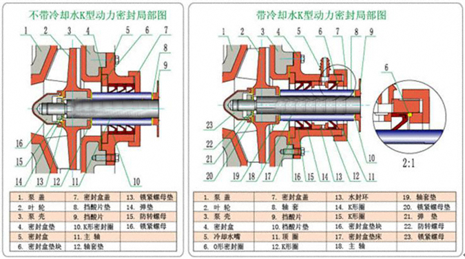 K型動力密封主要由副葉輪(或副葉片)與停車密封(橡膠油封)組成。工作時由于副葉輪(或副葉片)旋轉(zhuǎn)產(chǎn)生的離心力使密封腔處于負壓狀態(tài),從而阻止液體向外泄漏,此時,停車密封不起作用。橡膠油封的唇口因負壓而松開,與軸套產(chǎn)生一定間隙,減小其之間的磨損,延長了使用壽命;停機時,由于副葉輪(或副葉片)停止旋轉(zhuǎn),密封腔由負壓轉(zhuǎn)為正壓,停車密封開始工作,橡膠油封的唇口在壓力作用下緊緊包住軸套,從而達到密封目的。若允許冷卻水滲入介質(zhì)內(nèi),可選用帶冷卻水K型動力密封,即可添加外冷卻水裝置,延長油封的使用壽命。該密封的油封采用氟橡膠制成,主要適用于輸送含固體顆粒的料漿、含雜質(zhì)的污水等腐蝕性介質(zhì)(帶冷卻水K型動力密封用的冷卻水為潔凈的自來水,壓力適宜在0.05Mpa以內(nèi))。