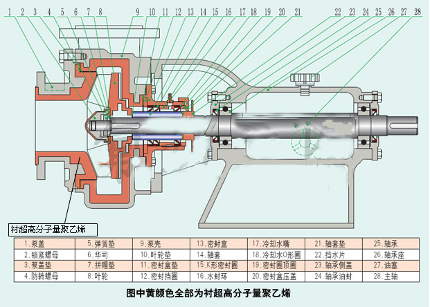 2) 泵體為鋼襯超高分子量聚乙烯結(jié)構(gòu),襯里厚度為8~20mm,該泵應(yīng)用了襯塑專利技術(shù),和其它同類泵相比較,具有襯里層抗熱變形性能好,耐開裂,防脫落,使用溫度高等優(yōu)勢。