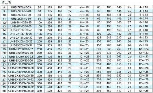 序號 型號 流量 揚程 轉(zhuǎn)速 功率(kw) 口徑 大概重量 (m3/h) (m) (r/min) 軸功率 配備電機 (mm×mm) 1 32UHB-ZK-3-13 3 13 2900 0.3 0.75 32×25 70~80 2 32UHB-ZK-5-20 5 20 2900 0.72 1.1 3 32UHB-ZK-8-18 8 18 2900 1.2 1.5 4 32UHB-ZK-5-25 5 25 2900 1.1 2.2 6 40UHB-ZK-10-18 10 18 2900 1.3 2.2 40×32 110~130 7 40UHB-ZK-15-15 15 15 2900 1.7 2.2 8 40UHB-ZK-10-30 10 30 2900 2.2 3 9 40UHB-ZK-15-25 15 25 2900 2.7 3 10 50UHB-ZK-20-20 20 20 2900 3 4 50×40 150~180 11 50UHB-ZK-25-18 25 18 2900 3.2 4 12 50UHB-ZK-20-30 20 30 2900 4.3 5.5 13 50UHB-ZK-25-28 25 28 2900 5 5.5 14 65UHB-ZK-30-20 30 25 2900 5 5.5 65×50 200~260 16 65UHB-ZK-40-15 40 15 2900 4.5 5.5 17 65UHB-ZK-30-32 30 32 2900 6.5 7.5 19 65UHB-ZK-10-50 10 50 2900 5.1 7.5 20 65UHB-ZK-20-50 20 50 2900 8.7 11 21 65UHB-ZK-30-50 30 50 2900 12 15 22 65UHB-ZK-30-60 30 50 2900 14.8 18.5 23 80UHB-ZK-40-20 40 20 2900 5.8 7.5 80×65 270~320 25 80UHB-ZK-50-15 50 15 2900 5.6 7.5 26 80UHB-ZK-50-20 50 20 2900 7.1 11 27 80UHB-ZK-45-35 40 35 2900 10.2 11 28 80UHB-ZK-50-30 50 30 2900 10.2 11 29 80UHB-ZK-60-30 60 30 2900 12.6 15 30 80UHB-ZK-50-50 50 50 2900 14.8 15 31 80UHB-ZK-50-60 50 60 2900 15.3 18.5 32 100UHB-ZK-80-15 80 15 2900 10.2 11 100×80 300~400 33 100UHB-ZK-60-30 60 30 2900 13.8 15 34 100UHB-ZK-60-40 60 40 2900 16.8 18.5 35 100UHB-ZK-60-50 60 50 2900 21.5 22 36 100UHB-ZK-80-30 80 30 2900 17.5 18.5 37 100UHB-ZK-100-20 100 20 2900 15 18.5 38 100UHB-ZK-100-25 100 25 2900 17.9 18.5 39 100UHB-ZK-100-30 100 30 2900 19 22 40 100UHB-ZK-100-40 100 40 2900 27 30 43 100UHB-ZK-120-20 120 15 2900 19 22 44 125UHB-ZK-140-20 140 20 2900 21 22 125×100 480~600 45 125UHB-ZK-150-30 150 30 2900 26 30 46 125UHB-ZK-140-40 140 40 2900 31.6 37 47 150UHB-ZK-200-30 150 30 1450 41.5 45 150×125 800~1100 48 150UHB-ZK-250-30 250 30 1450 42.9 45 49 150UHB-ZK-150-40 150 40 1450 42 45 50 200UHB-ZK-300-25 320 25 1450 37.3 45 200×150 1000~1400 51 200UHB-ZK-350-20 350 20 1450 37.1 45 52 200UHB-ZK-400-18 400 18 1450 38.3 45 53 200UHB-ZK-320-32 320 32 1450 51.8 55 53* 200UHB-ZK-350-28 350 28 1450 45.2 55 54 200UHB-ZK-400-25 400 25 1450 70 75 55 200UHB-ZK-450-20 450 20 1450 70 75 55* 200UHB-ZK-250-45 250 45 1450 74 75 56 250UHB-ZK-500-20 500 20 1450 67 75 250×200 2200~3000 57 250UHB-ZK-500-26 500 26 1450 78.3 90 58 250UHB-ZK-500-37 500 37 1450 100.7 110 59 250UHB-ZK-600-32 600 32 1450 99 110 60 250UHB-ZK-500-45 500 45 1450 123.8 132 61 300UHB-ZK-700-40 700 40 1450 139.2 160 300×250 3000 62 300UHB-ZK-850-35 850 35 1450 133.8 160 63 300UHB-ZK-950-30 950 30 1450 140.3 160 64 300UHB-ZK-1000-28 1000 28 1450 148.7 160 65 350UHB-ZK-1800-25 1800 25 1450 226.3 250 350×300 3500 以上型號主要型號,如所需參數(shù)不在此表內(nèi),請來電詢問(15956372963)